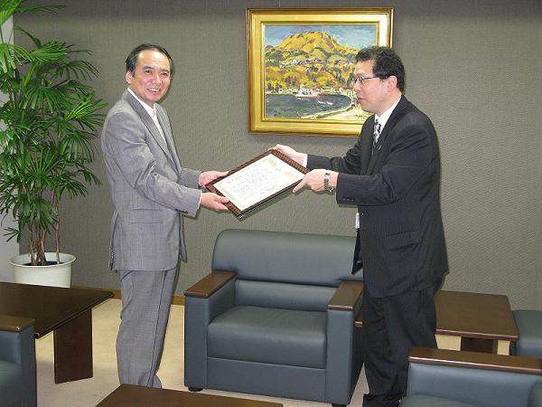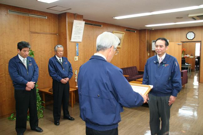 農林中金熊本支店の伊藤支店長から表彰状を受け取る森支店長