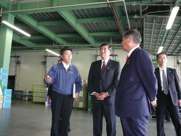 農畜産物の価格低迷や生産資材の高騰など農業を取り巻く環境は厳しい中、石破茂農林水産大臣が4月11日、会富町のJA熊本市野菜選果施設と河内町のJA熊本市夢未来柑橘選果場を視察に訪れました。自民党第二選挙区支部と熊本県農業者政治連盟熊本市支部の主催で、地元選出の林田彪衆院議員や野田毅衆院議員らも駆けつけました。
