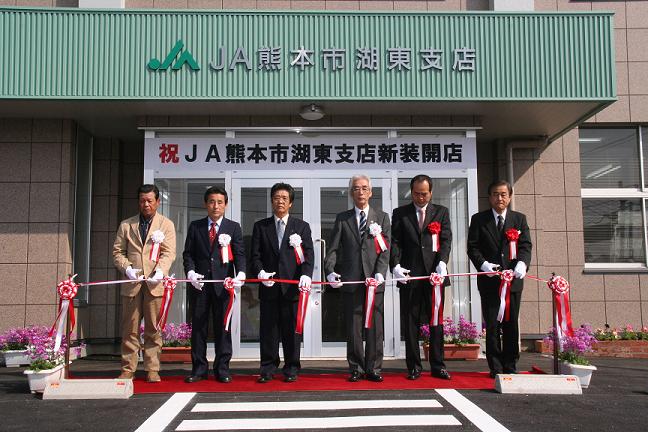湖東支店のリニューアルを祝して4月8日、同市沼山津で新装開店オープン式を開き、同支店の組合員や生産部会役員、JA役職員ら約70人が出席しました。
