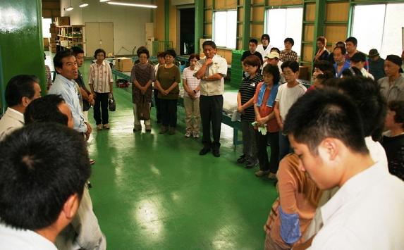 選果初日の朝礼であいさつする津田部会長(左)