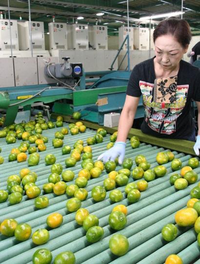 熊本市河内町のJA熊本市夢未来柑橘選果場で9月15日、県独自品種の極早生温州ミカン「肥のあかり」の選果が始まりました。初売りは17日で、初日は43㌧を選果し、主に関東の市場を中心に初出荷しました。