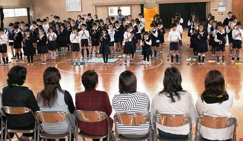 感謝の会では、児童の代表4人がナス作りなどの感想を発表。収穫などの様子をスライドショーで振り返り、合唱やリコーダー演奏などを全員で披露しました。また、事前に用意していた手作りのメダルを訪れた農家ら一人ひとりの首に掛け、感謝の気持ちを書いた手紙も贈りました。