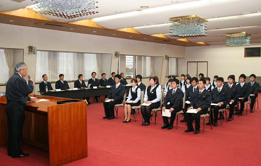 「礼節を重んじ、誇りを持って」と村上組合長の訓示を受ける新入職員ら