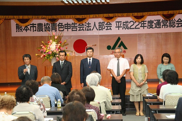 熊本市農協青色申告会法人部会は8月31日、平成22年度通常総会を本店で開き、会員(73社)はじめ行政や顧問税理士、JA関係者ら約70人が出席しました。