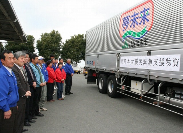 JA熊本市柑橘部会は3月19日、東日本大震災の被災地に救援物資を送り出しました。物資はデコポン300箱(1箱10㌔)のほか、茶のペットボトル140箱(1箱24本)とミカンジュースなど19種類合計2万4720本。岩手県大船渡市の「夢未来みかん」販売店・㈱マイヤが三陸沿岸に展開する16店舗を通じ、避難所などの被災者に届けました。