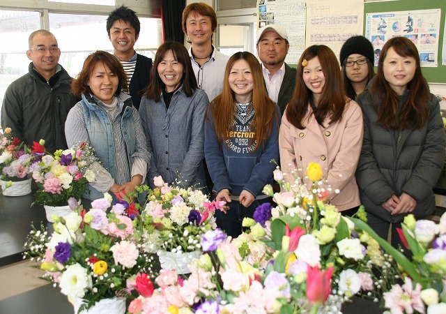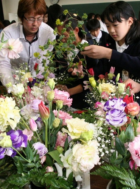 花の種類や栽培過程などを部会長の原口和大さんが写真を使って説明。その後、児童たちは同小を卒業した生花店主らを講師に、生産者と一緒に思い思いに制作しました。