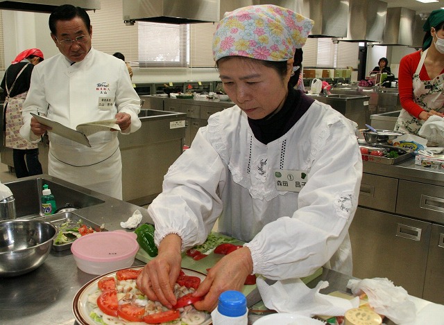 県内の主婦や学生らから募ったレシピ41点の中から審査を通過した9人が会場で調理。ナスやトマトなどを使った多彩なメニュー四人前を30分以内で完成させました。ホテル熊本テルサの土山憲幸総支配人らが料理の手軽さだけでなく、味や独創性などを点数で評価。最優秀賞に森田昌子さん(麻生田)の「野菜たっぷりオーブン焼き」を選びました。