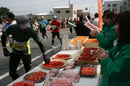 豊かな自然を感じてもらおうと南区会富町の飽田支店前では、農家が丹精して育てた「夢未来」ブランドの農産物を用意。ミニトマトやミカン、ナスのジャムを乗せたクラッカーやゼリーの他、おにぎりや県産の牛乳などを生産者やJA職員ら約80人が走行中のランナーに振る舞い声援を送りました。