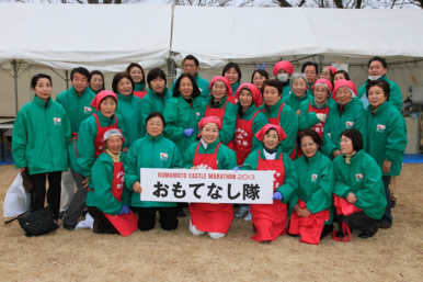 2月17日に開催された第2回熊本城マラソンで、JA熊本市の生産部会や女性部、職員らがランナーを熊本市の農産物で応援しました。