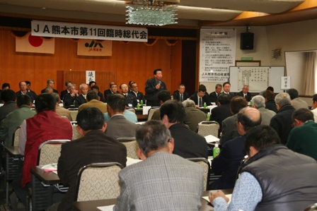 JA熊本市は3月15日、JA熊本市本店で第11回臨時総代会を開きました。総代539人(本人出席97人、書面出席442人)が参加。強い農業作り交付金を活用した、共同施設の整備に取り組むことを参加者全員で決議しました。