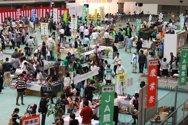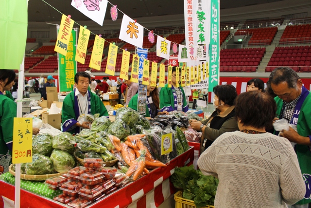 会場では、熊本市産の農畜産物や加工品の試食販売や、28支店が13グループに分かれて出し物を出店しました。主要9品目(ミカン、メロン、ナス、トマト、ミニトマト、ピーマン、牛肉、牛乳、米)を生産者が自ら消費者にPR。ステージイベントでは農産物を紹介し、来場者とジャンケンをして農産物をプレゼントしました。