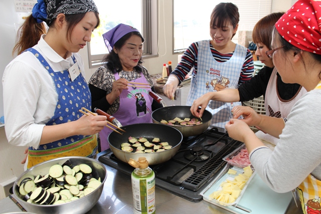 JA熊本市茄子部会女性部は10月16日、保育園の調理師の研修会で、保育園児も食べやすいナス料理の講習会を西部公民館で行いました。参加者は、熊本市西部地区の保育園の調理師20人。調理師らは生産者から直接調理法を学び、ナス料理を試作・試食して交流を深めました。