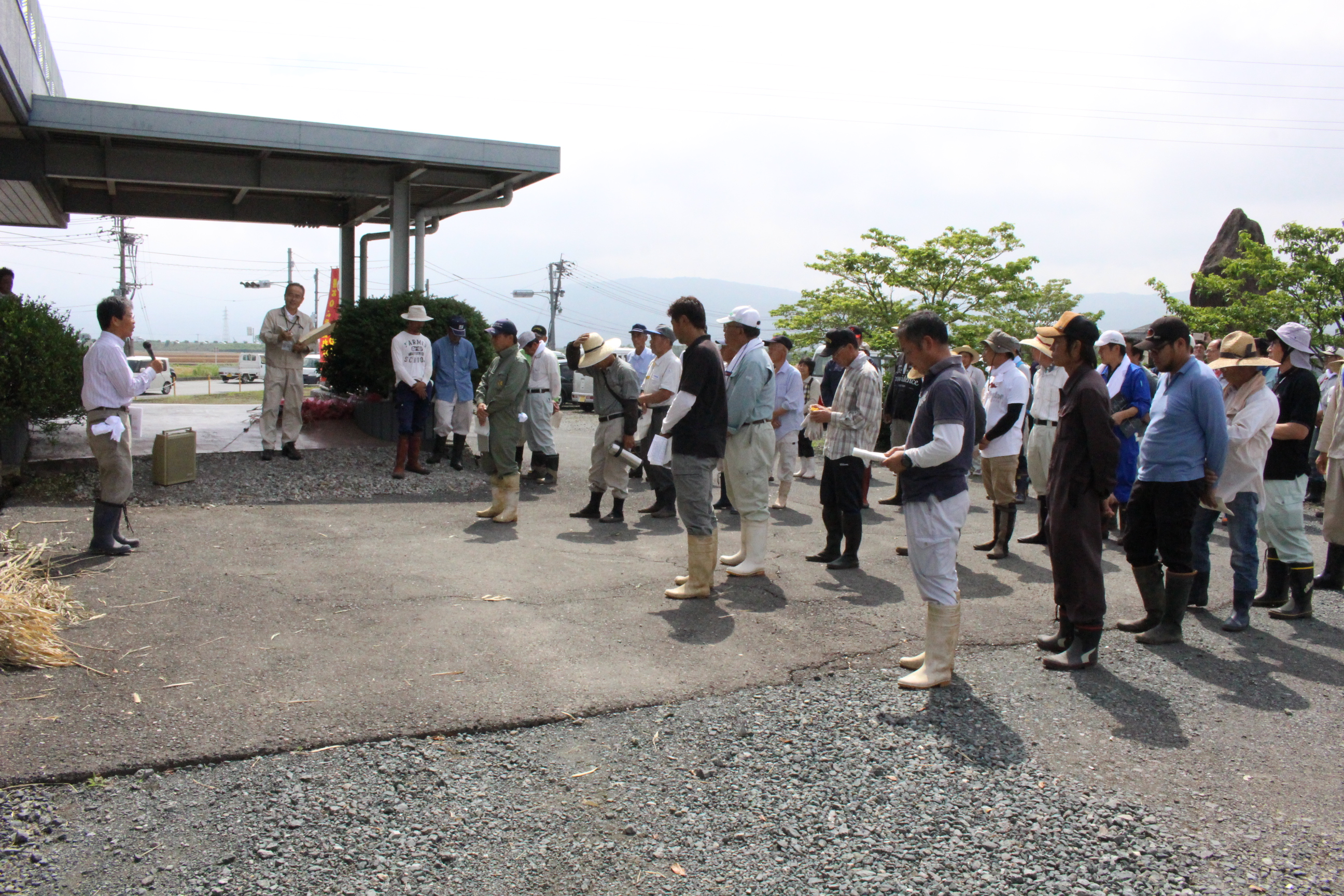 農事組合法人秋津営農組合の役員、オペレーター、麦作農家、国・県・市やJAなど60人が参集