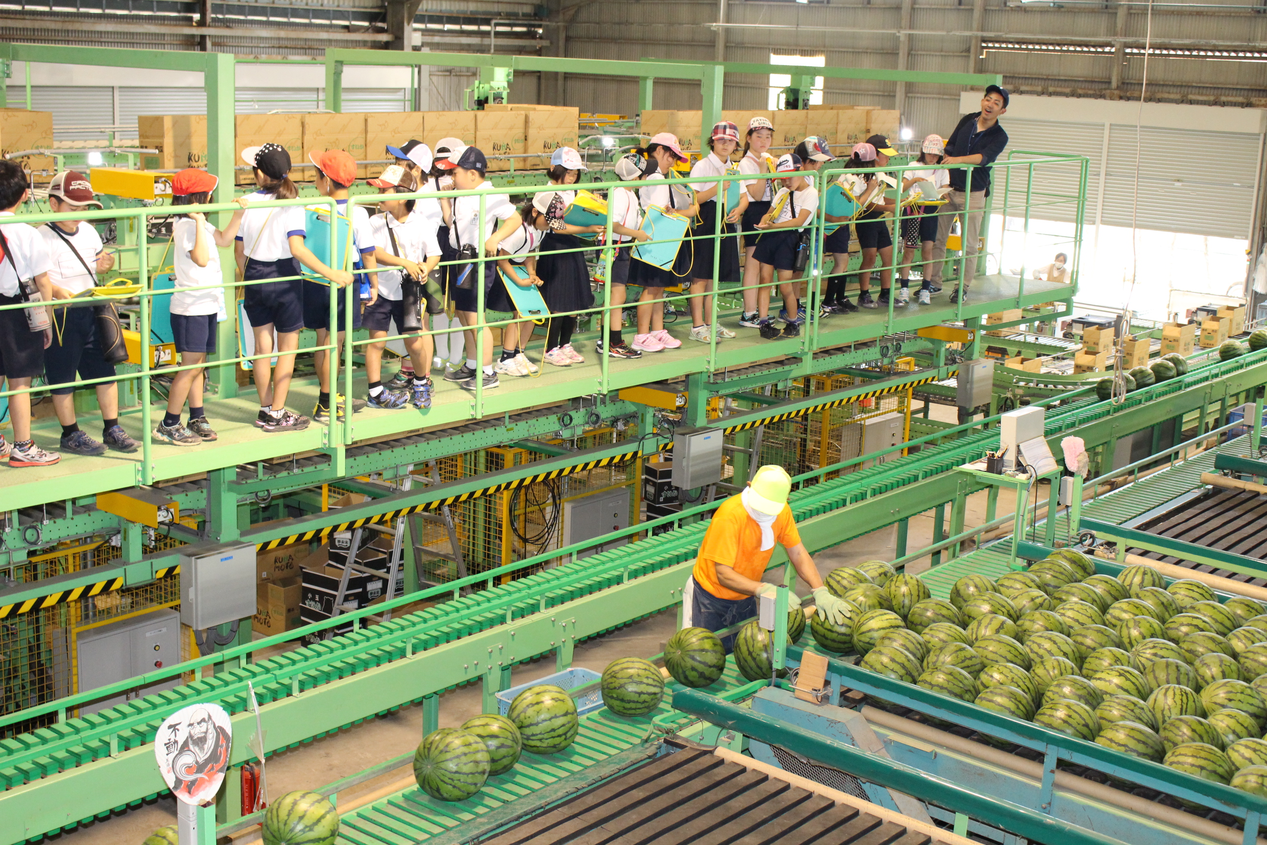 出荷終盤を迎え、次世代選果機でスイカが順調に選果されていく様子を、児童は興味深く見学。営農担当職員による質疑応答の後、地元でとれたスイカを試食した児童は「おいしい」と笑顔でした。