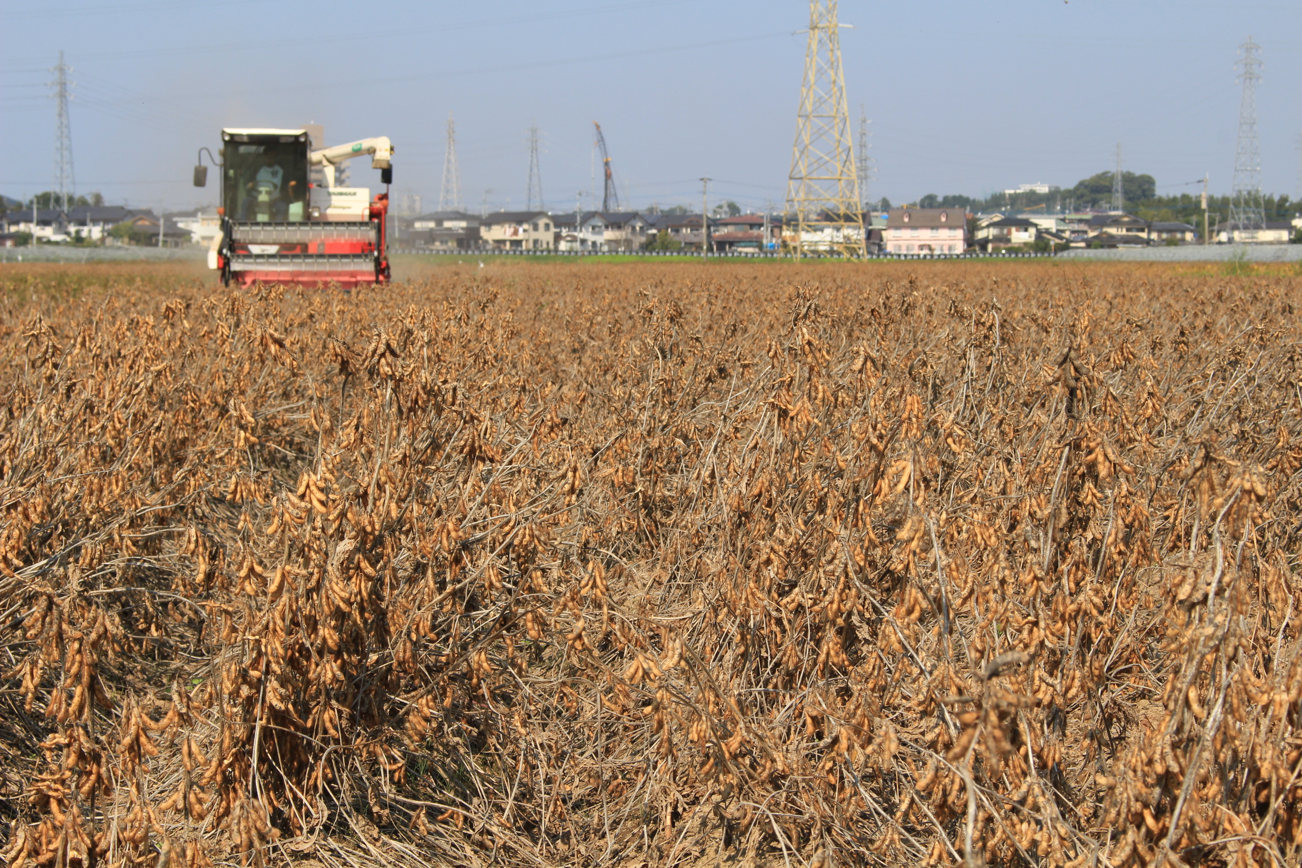 熊本市の農事組合法人秋津営農組合は11月5日、大豆「すずおとめ」の収穫を始めました。今年の大豆作付面積は「すずおとめ」60㌶(前年比4倍)と「フクユタカ」90㌶(同1・8倍)を合わせて昨年比2・3倍の150㌶。熊本地震で、排管の損壊や水田の隆起などの影響があり、水稲の作付けができなかったためです。