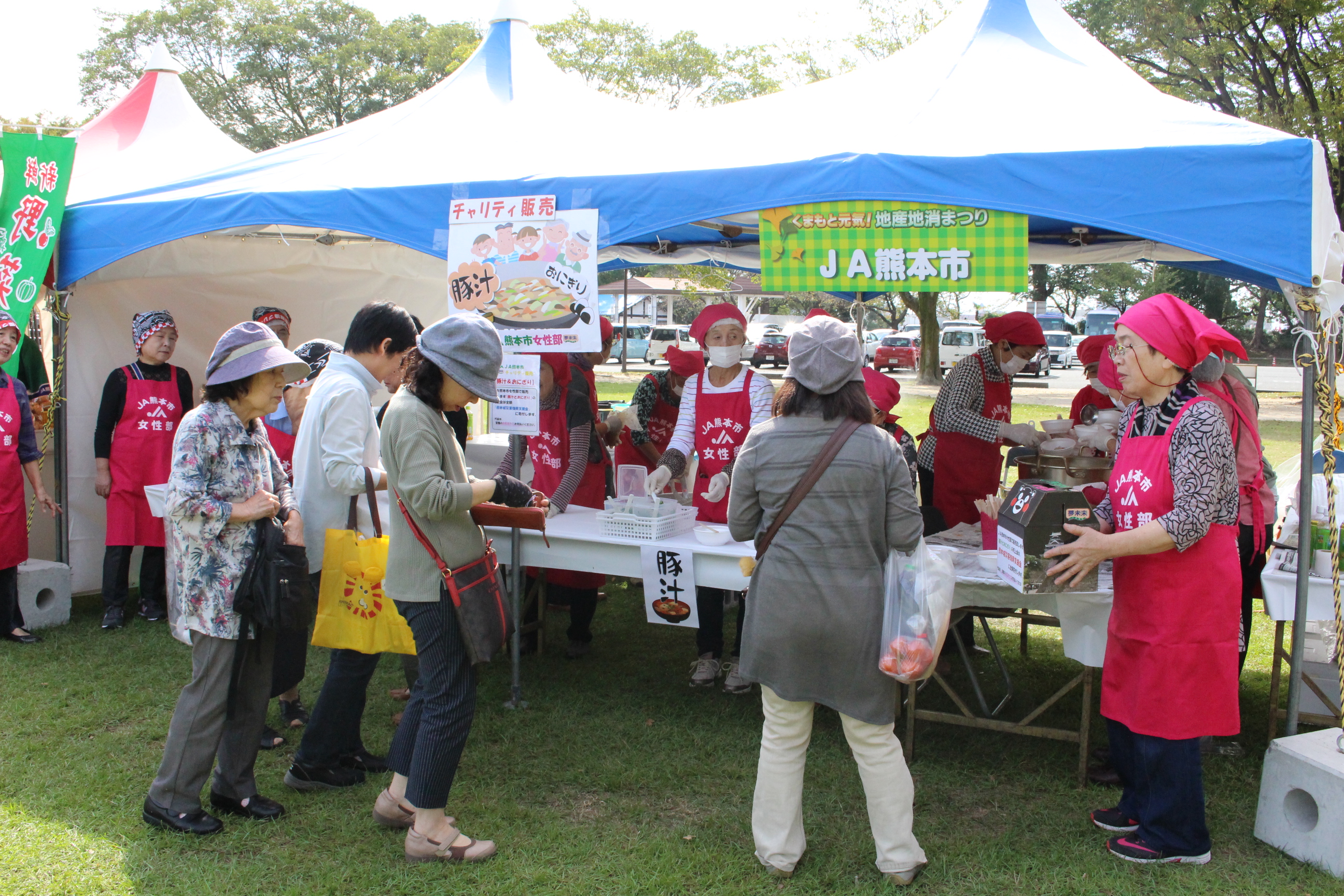 JA熊本市女性部は10月15、16日、熊本城二の丸公園で開かれた「KAB元気フェスタ2016」でチャリティー販売をしました。手作りの味噌や、とれたての野菜を使った豚汁1100食、新米「くまさんの力」のおにぎり1500食を販売。売上金22万1528円は全額「熊本城災害復興支援金」に寄付します。部員約60人が参加。田島イツ子女性部長は「来場者に地産地消PRして、熊本のシンボルである熊本城の復興を支援したい」と話しました。