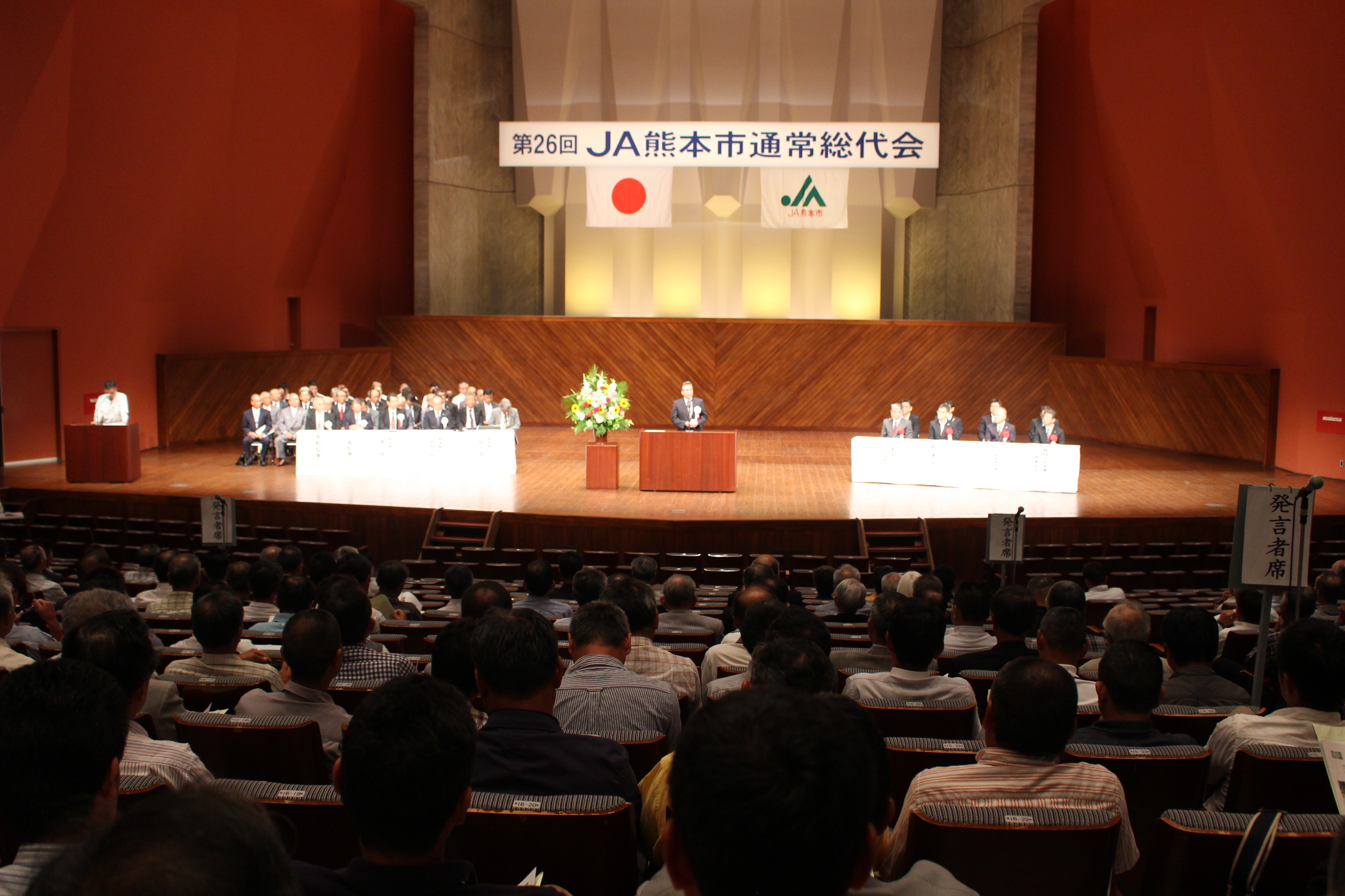JA熊本市は6月27日、第26回通常総代会を熊本県立劇場で開きました。平成29年度事業計画他2議案と、JA熊本市の自己改革実践に関する特別決議、「平成28年熊本地震」から復旧・復興に関する特別決議の5議案を出席総代343人の賛成多数で可決しました。