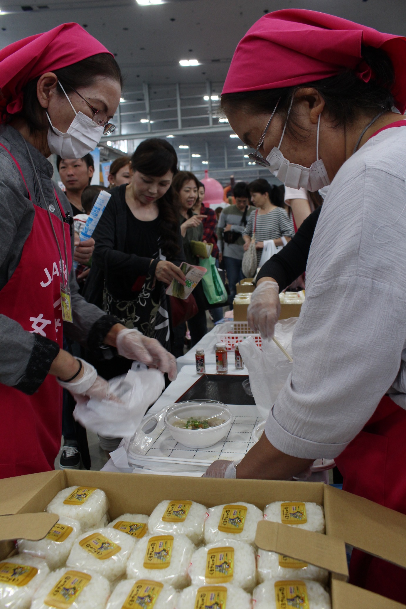 JA熊本市女性部は10月14、15日、グランメッセ熊本で開かれた「KAB元気フェスタ2017」でチャリティー販売をしました。手作りの味噌や、とれたての野菜を使った豚汁1000食、新米「くまさんの力」のおにぎりを販売し、2日間の売上金22万7900円は全額「熊本城災害復興支援金」に寄付します。