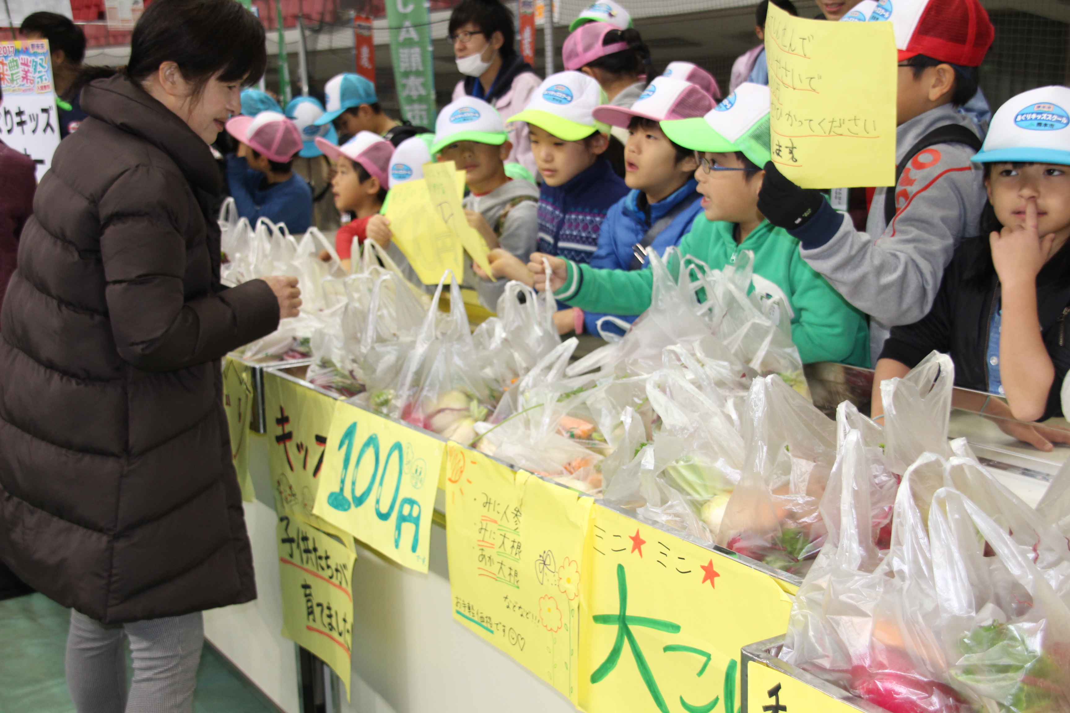 スクール生は、手作りのPOP(購買時点広告)を手に持ち、「新鮮野菜はいかがですかー?」と元気良くPRしました。