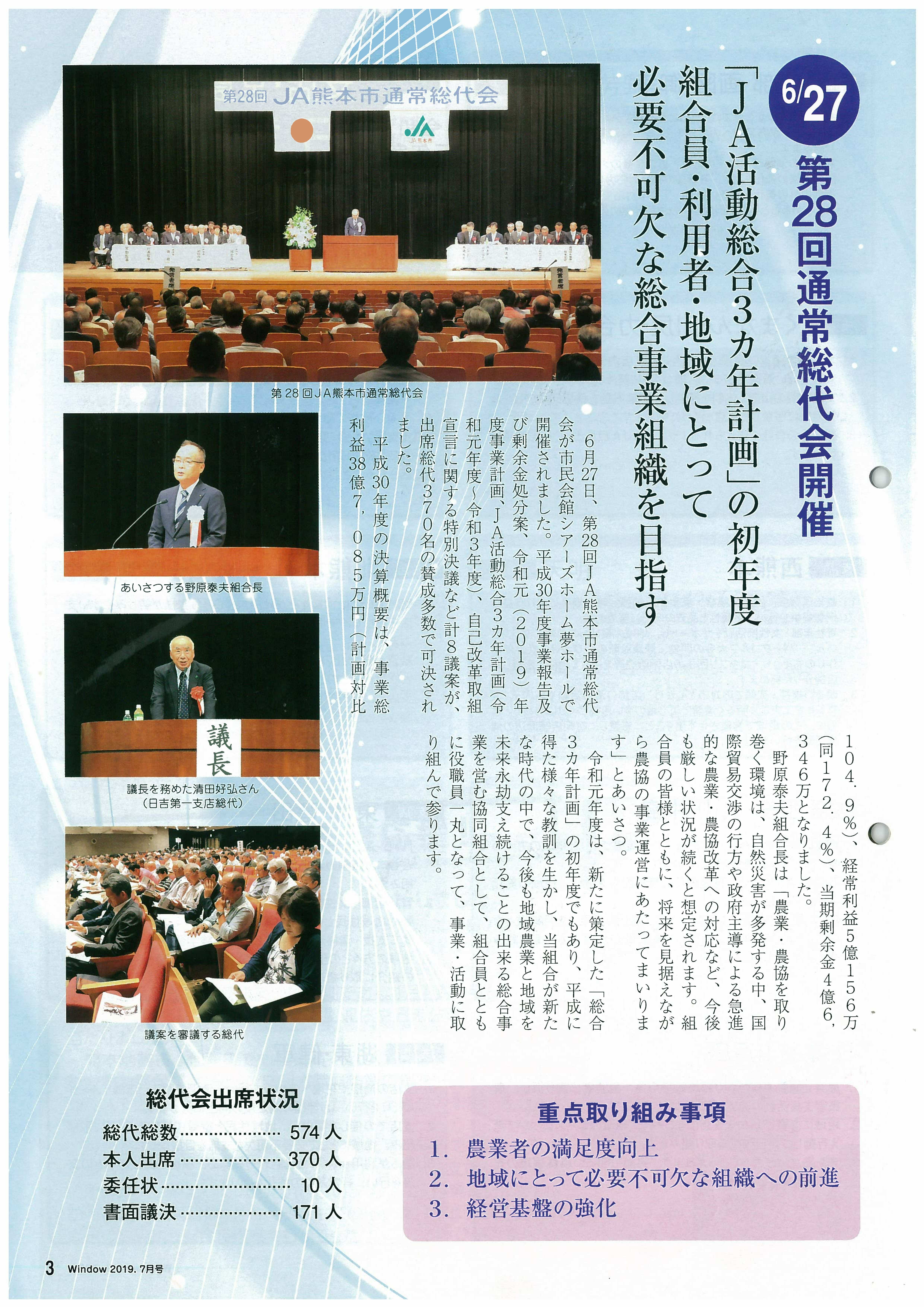 6月27日、第28回JA熊本市通常総代会が市民会館シアーズホーム夢ホールで開催されました。